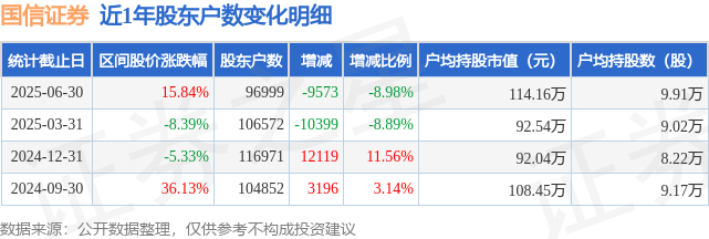 从股价来看,2025年3月31日至2025年6月30日,国信证券区间涨幅为15.84%,在此期间股东户数减少9573.0户,减幅为8.98%。